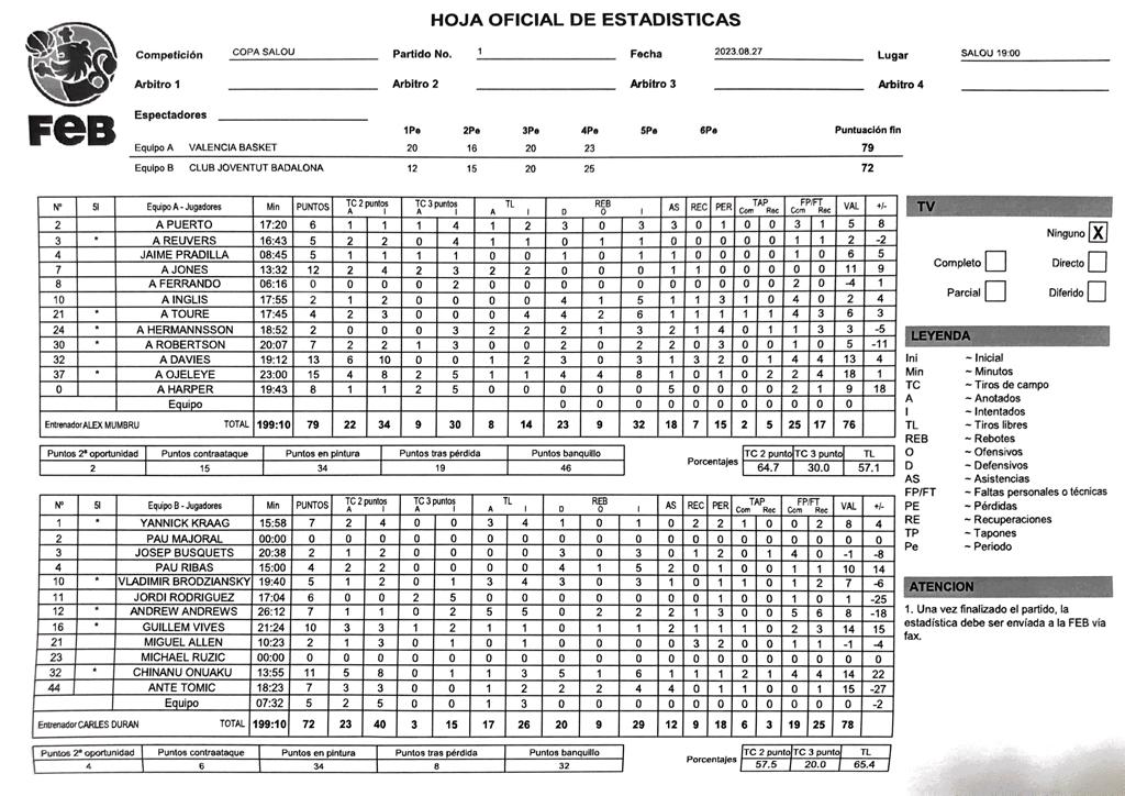 En Salou, el pabellón era claramente verdinegro y ambos equipos dieron espectáculo en un partido que en algunos momentos tuvo tensión de partido oficial. Valencia Basket dominó desde mediados del primer cuarto y solo al final del último cuarto la Penya se puso por delante pero de nuevo la fuerza valenciana superó a los de Carles Duran.